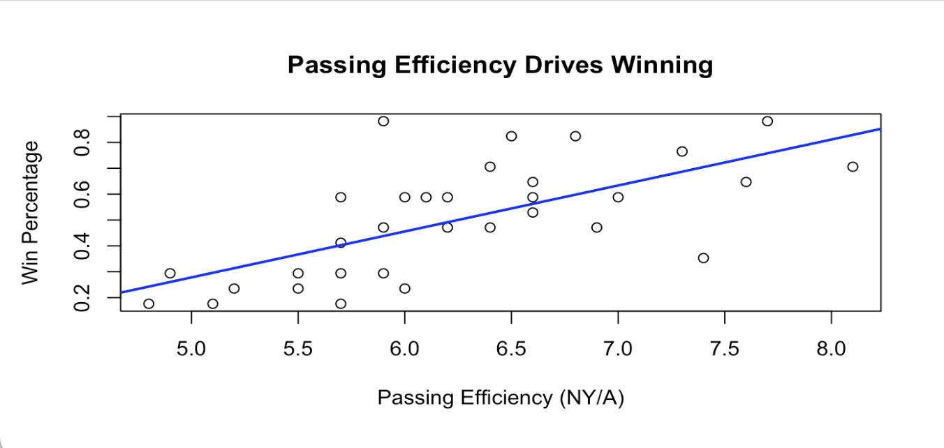 What the data does is clarify why that matters. It is not just that good quarterbacks look better or make highlight plays. It is that passing efficiency directly translates into wins in a way that other parts of the game do not.